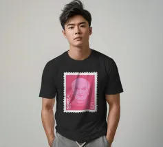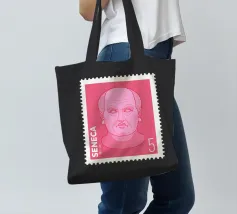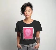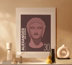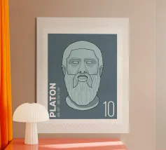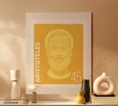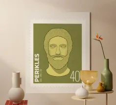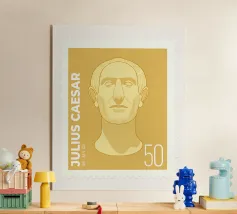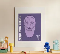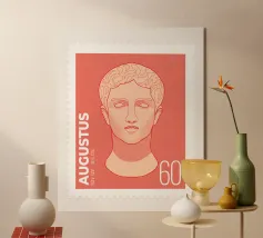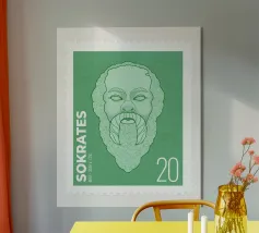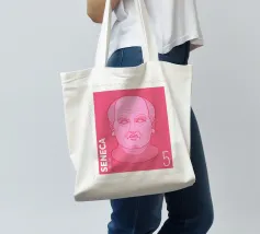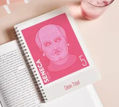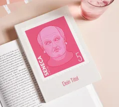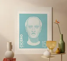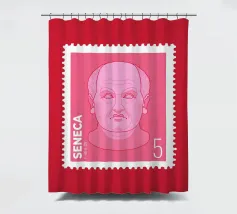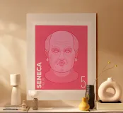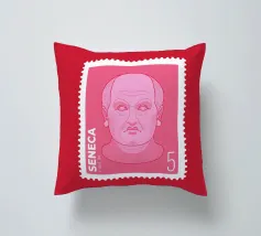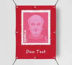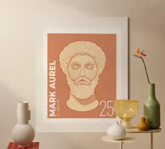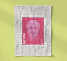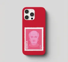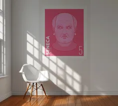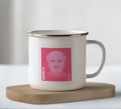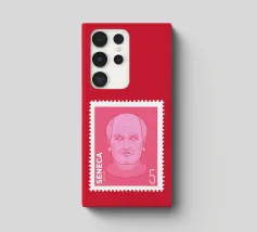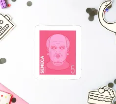 Illustration of a stamp featuring the image of the philosopher Seneca on a transparent background. The background colour can be customised.