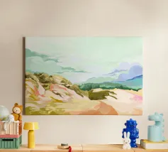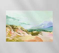 Questo bel dipinto arioso e colorato raffigura il vento, il movimento e l'aria salata del mare e delle dune. Illustrazione colorata con toni pastello, dipinta digitalmente (senza AI), una stampa fresca sulla vostra parete!
