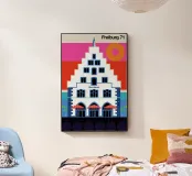 Questa immagine mostra un'interpretazione vivace e moderna dell'iconico edificio Kornhaus di Friburgo. Ideale per gli appassionati di architettura o per chiunque apprezzi l'arte unica ispirata alla città.