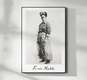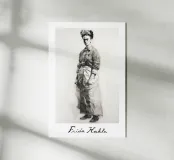 Disegno grafico a mano di Frida Kahlo: questo dettagliato disegno digitale mostra Frida Kahlo in una potente postura eretta che irradia forza e determinazione. Le ombreggiature e i tratti sottili conferiscono all'immagine profondità e dimensione. La firma di Frida è integrata con stile.