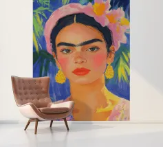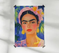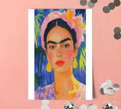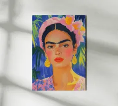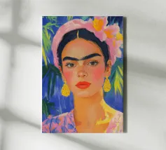Ritratto ad olio di Frida Kahlo con fascia rosa, orecchini gialli e abiti floreali. Le pennellate impressioniste, lo sfondo blu pastello con foglie di palma, il primo piano, la luce soffusa, la tavolozza di colori caldi e i dettagli del viso e dei capelli sottolineano lo sguardo espressivo di Frida.