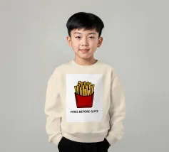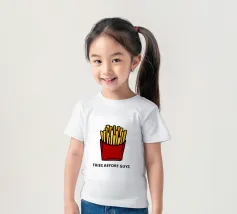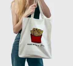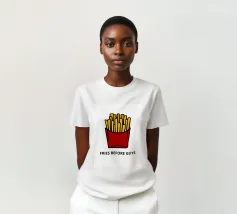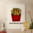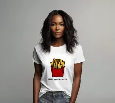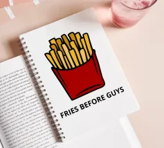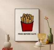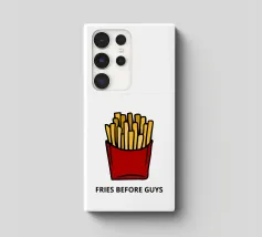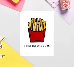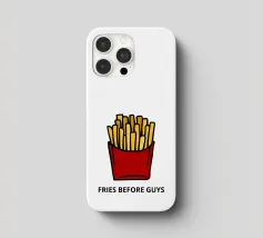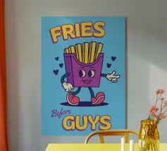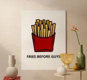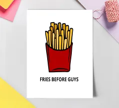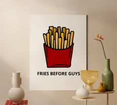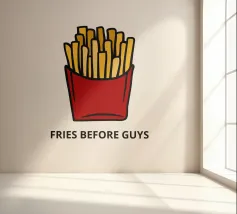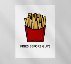 Una grafica audace presenta un contenitore rosso pieno di patatine fritte giallo oro sopra il testo umoristico "FRIES BEFORE GUYS".