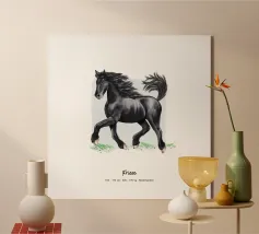 Il Frisone - un cavallo maestoso e allo stesso tempo forte, con molta pazienza e dolcezza. Date un'occhiata anche alle altre razze di cavalli illustrate! Tutte le mie illustrazioni sono realizzate a mano e curate nei minimi dettagli. Se necessario, il colore di sfondo del disegno può essere modificato in base ai vostri desideri.