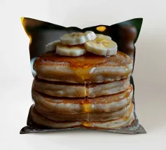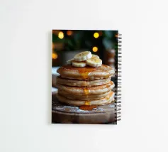 frittelle fette di banana sciroppo d'acero frittelle impilate colazione zucchero a velo tavola di legno luci bokeh ambiente accogliente colazione dolce sciroppo dorato soffici frittelle cibo a strati tavolo in legno illuminazione calda condimenti per la colazione frittelle guarnite sciroppo che cola cibo di conforto pasto mattutino