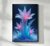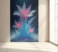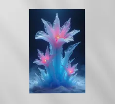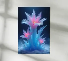 Un magico fiore di ghiaccio risplende al chiaro di luna, con petali cristallini e gelidi e un'incantevole luce rosa e blu. Questa fantastica scena invernale irradia mistero e bellezza. Perfetto per gli appassionati di arte digitale, fantasy e immagini surreali della natura.