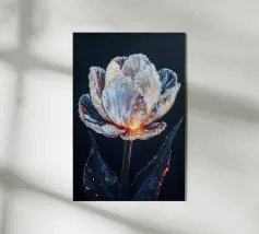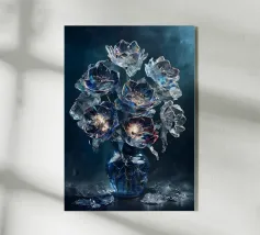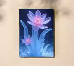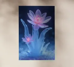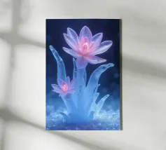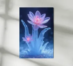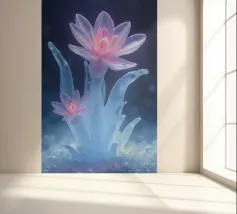 Un magico fiore di loto di ghiaccio emana un incantevole bagliore rosa in un ambiente gelido e misterioso. I petali cristallini brillano sotto la fredda luce della luna, mentre lo stelo ghiacciato si illumina sottilmente. Questa immagine surreale evoca sentimenti di tranquillità, meraviglia e misticismo.
