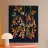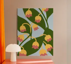 Ein verspieltes, botanisches Muster mit hängenden glockenförmigen Blüten in Rosé-, Korallen- und Rottönen. Die geschwungenen Ranken wirken wie ein natürlicher Vorhang, durchsetzt von stilisierten Blättern in warmem Orange und kühlem Grün. Auf dunkelblauem Hintergrund entsteht ein moderner, leicht folkloristischer Look.