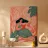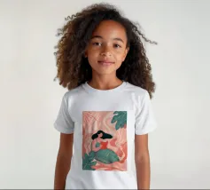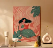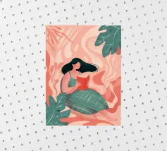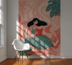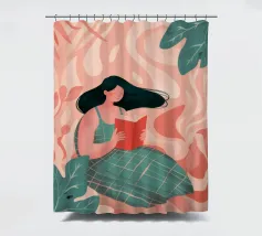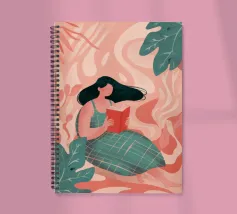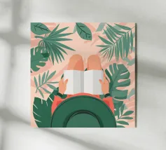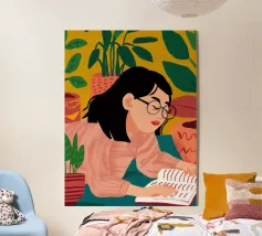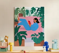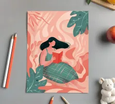 Questo dipinto raffigura una persona con i capelli scuri, seduta a leggere un libro in un ambiente verde e lussureggiante. Lo sfondo è pieno di grandi foglie e piante, che creano un'atmosfera pacifica e coinvolgente.