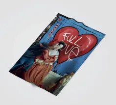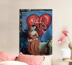 "In questo collage digitale, ci viene presentata una scena romantica in cui una coppia appena innamorata si trova nel punto più tenero della loro relazione. L'opera combina elementi di dipinti neoclassici con il fotoritocco digitale, ottenendo un'armoniosa fusione di elementi classici e moderni. Le figure, tratte da opere d'arte storiche, sono integrate in un contesto contemporaneo, evidenziando l'atemporalità dell'amore e della tenerezza".