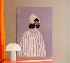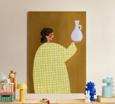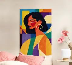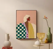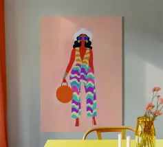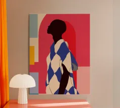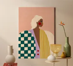 Elevate il vostro spazio con l'opera d'arte da parete Funky Blouse, caratterizzata da una stampa artistica vivace e colorata. Questo pezzo unico combina motivi a righe e a scacchi, insieme a un semplice ritratto illustrato, progettato per dare un tocco giocoso a qualsiasi stanza.