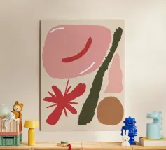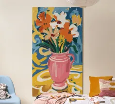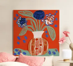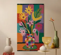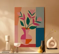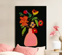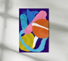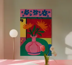 Un'opera d'arte astratta vibrante ed espressiva con una fusione di colori audaci di ispirazione fauvista come il magenta, l'arancione e il nero. Le pennellate e le forme energiche creano un'opera dinamica e appassionata.