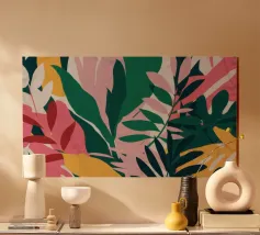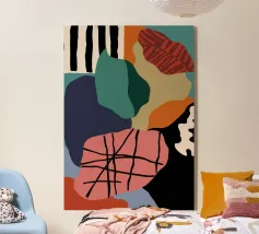 Un'opera d'arte astratta vibrante ed espressiva con una fusione di colori audaci di ispirazione fauvista come il magenta, l'arancione e il nero. Le pennellate e le forme energiche creano un'opera dinamica e appassionata.