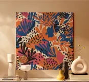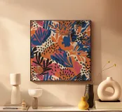 Un motivo audace ed energico che combina la stampa leopardata con fiori e foglie tropicali astratti in una vivace combinazione di colori, creando una fusione selvaggia e alla moda.