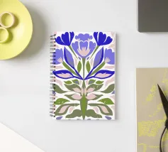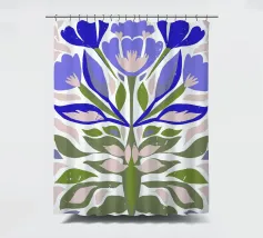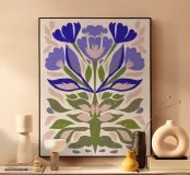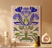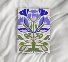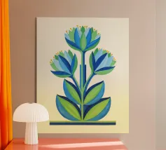 floreale astratto, folk moderno, forme audaci, arte floreale blu, botanica minimale, ispirazione naturale, floreale unico, arte popolare contemporanea, petali stravaganti, decorazione murale da giardino, giardino astratto, stampa floreale moderna