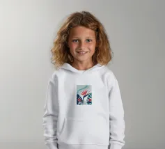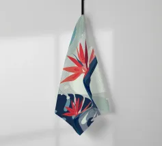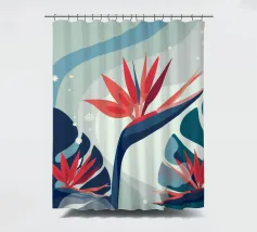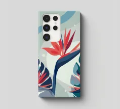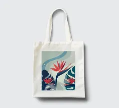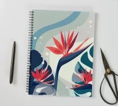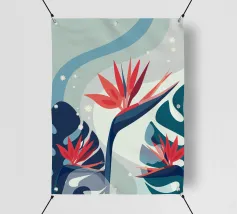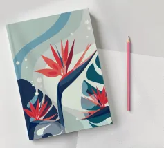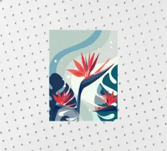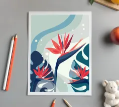 Le illustrazioni dettagliate mostrano la delicata bellezza dei garofani e il fogliame rigoglioso delle monstere, creando un'atmosfera tranquilla e rinfrescante.