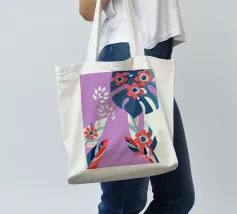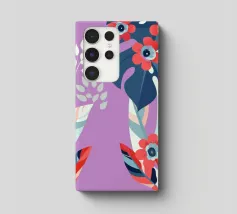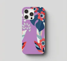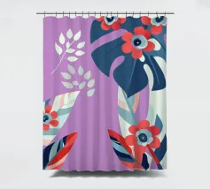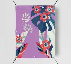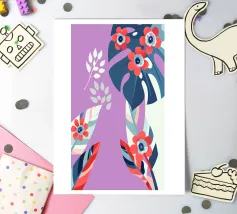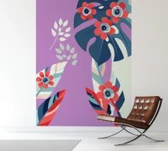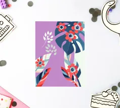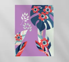 Le illustrazioni dettagliate mostrano la delicata bellezza dei garofani e il fogliame rigoglioso delle monstere, creando un'atmosfera tranquilla e rinfrescante.