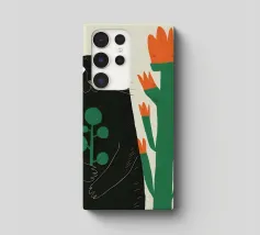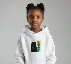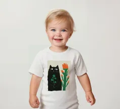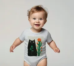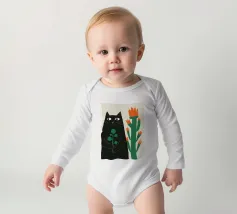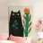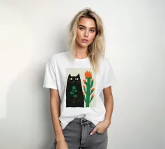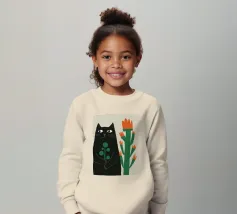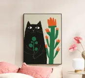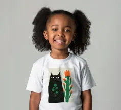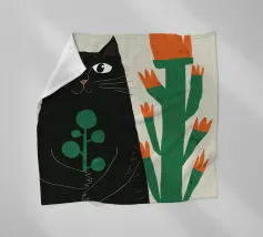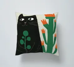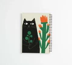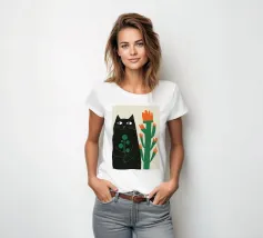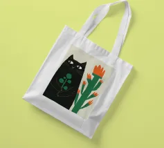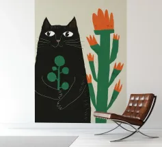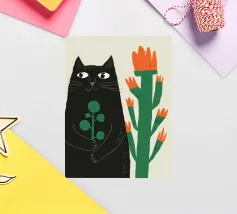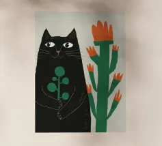 Illustrazione di due gatti neri in piedi accanto a una grande pianta di cactus. Lo stile è semplice e moderno, con una qualità grafica affascinante.