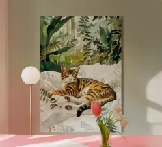 gatto gatto arancione gatto che dorme letto cuscini piante fogliame pianta da interno foglie tropicali foglie di monstera cuscini relax arredamento per la casa animale domestico riposo consistenza morbida animale domestico calma tempo libero foglie verdi