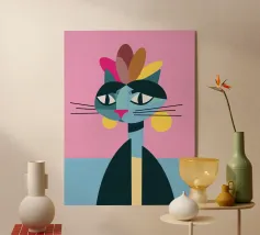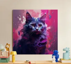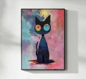 cat whiskers big eyes abstract background colorful splatter effect wet paint look feline tail ears cute cartoon whimsical playful vivid colors gradient animal artistic contrast fantasy theme