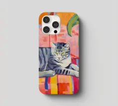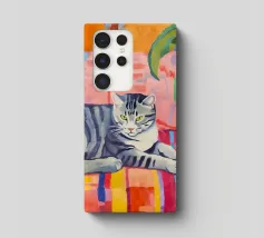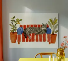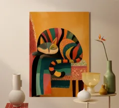 Stravagante illustrazione ad acquerello con adorabile gatto che si rilassa sul divano in colori caldi