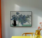 gatto nero iris vaso fiori fiori blu occhi gialli zampa sollevata composizione floreale vaso bianco tavolo interno botanico animale domestico arredamento per la casa petali di fiori foglie coda di gatto rappresentazione artistica elementi di natura morta pittura