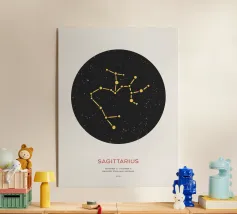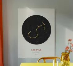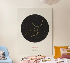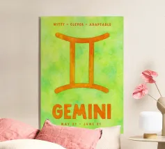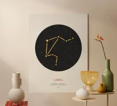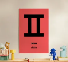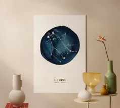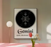 Questo disegno rappresenta il segno zodiacale dei Gemelli, simboleggiato da due gemelli in equilibrio e armonia. Con una composizione circolare, l'immagine gioca su elementi geometrici e punti stilizzati che evocano la dualità e la versatilità di questo segno. Le linee e i dettagli centrali sono equilibrati, suggerendo il legame tra le due personalità gemelle, mentre la disposizione dei punti intorno al cerchio enfatizza l'idea del movimento e del continuo cambiamento, tratti tipici dei Gemelli. Il design minimalista con contrasto bianco e nero lo rende elegante e facilmente adattabile a diversi stili di arredamento.