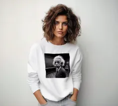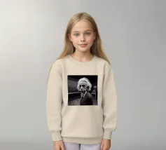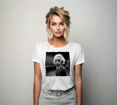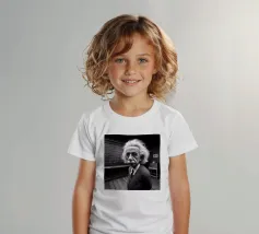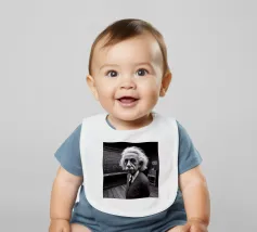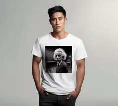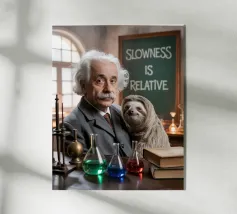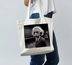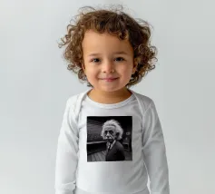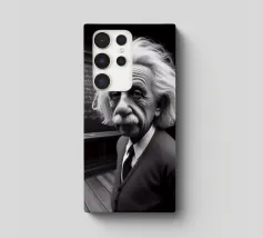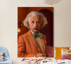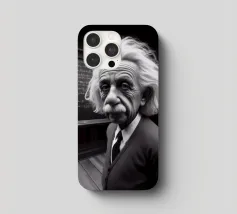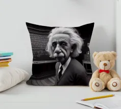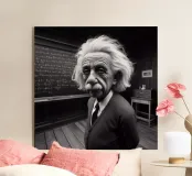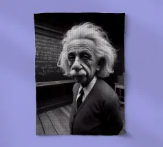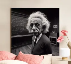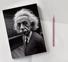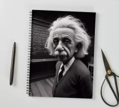 Albert Einstein davanti ai suoi appunti di genio. Una caricatura della straordinaria mente scientifica.