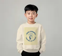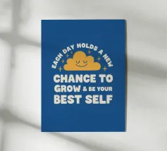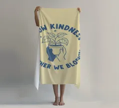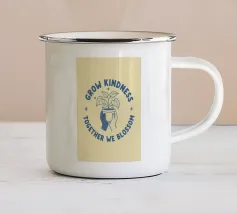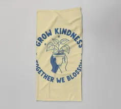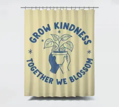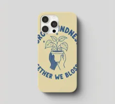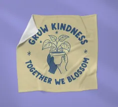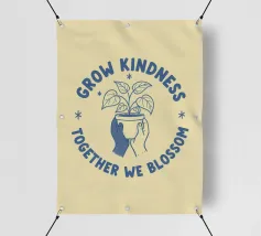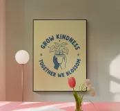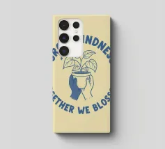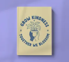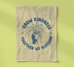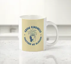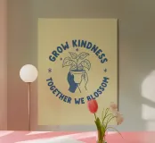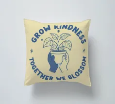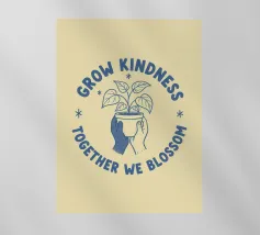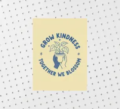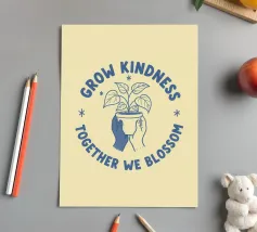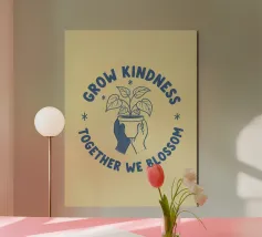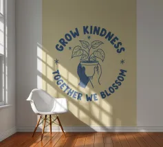 Una pianta in vaso con un volto sorridente sulle foglie è circondata dalle parole ispiratrici "COLTIVA LA GENTILEZZA, INSIEME FIORIREMO". Quest'opera a tema botanico celebra la crescita personale e il potere della compassione.