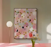 A playful yet refined abstract painting featuring scattered marks and layered pastel tones. This artwork brings lightness and movement into a space without overwhelming it.