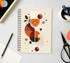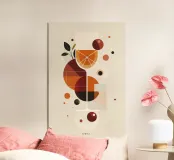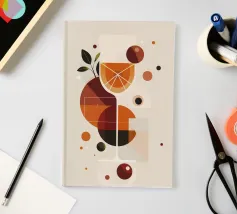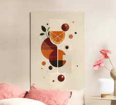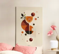 Un'illustrazione geometrica giocosa e minimalista che celebra lo spirito rinfrescante di un cocktail Spritz. Forme di arance calde, rossi profondi e verdi terrosi si intersecano intorno a un bicchiere stilizzato, formando fette di agrumi astratte e bolle galleggianti. La composizione pulita e l'estetica retro-moderna evocano allo stesso tempo raffinatezza e leggerezza, catturando l'essenza di una bevanda vibrante ed edificante.