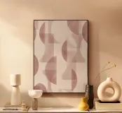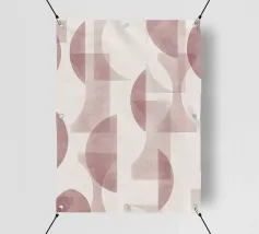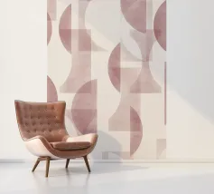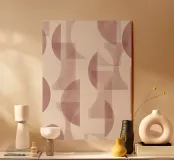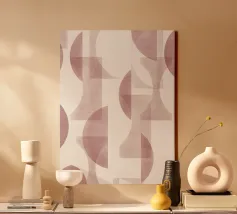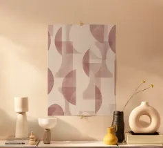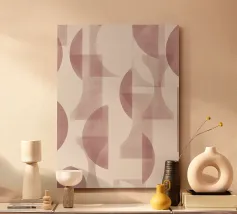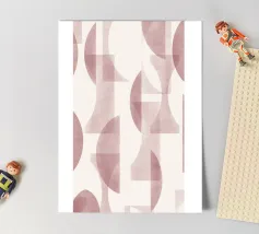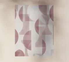 Il disegno presenta un'accattivante disposizione di cerchi, rettangoli e forme astratte di foglie sovrapposte, che alludono sottilmente a forme organiche all'interno della struttura. La texture granulosa aggiunge profondità e interesse visivo.