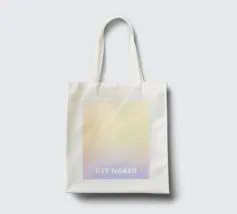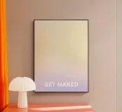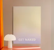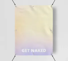 "GET NAKED" in white lettering on a soft colour gradient, inspired by sunset colours. Minimalist design with subtle rays of sunshine, modern aesthetics and high quality detail - clear, calm and stylish.
