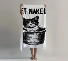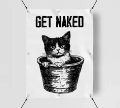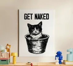 Un simpatico gatto bianco e nero fa capolino da un secchio di legno. Sopra il gatto, il testo "GET NAKED" è scritto in grassetto.