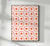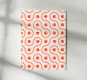Ghiande grafiche rosa e rosse accoppiate a linee ondulate di piastrelle truchet su uno sfondo crema chiaro.