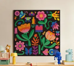 Una deliziosa trapunta patchwork di simpatiche e colorate icone da giardino, tra cui un'amichevole ape, un arcobaleno, un sole sorridente e una coccinella. Questa opera d'arte è una pura espressione di gioia e meraviglia infantile.