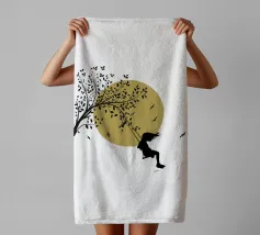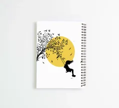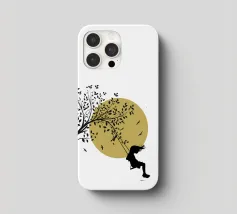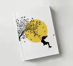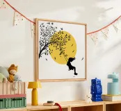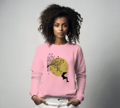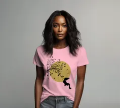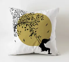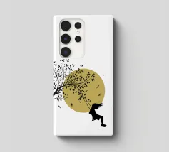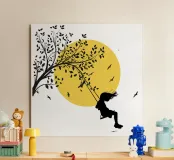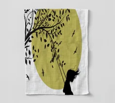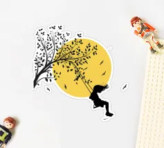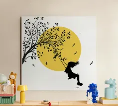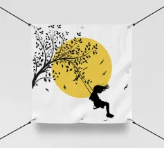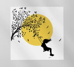 Illustrazione in stile street art, una ragazza su un'altalena, l'altalena è appesa al ramo di un albero, gli uccelli volano nel cielo sullo sfondo, ottima scelta per ogni momento e occasione, perfetta anche come idea regalo