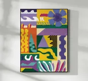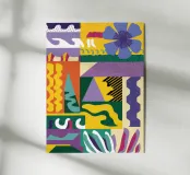 Una composizione astratta giocosa ed energica fatta di varie macchie di colore e motivi, tra cui fiori, griglie e strisce, come una vibrante trapunta.
