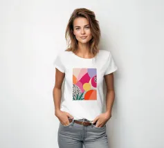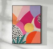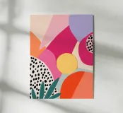 Questa allegra illustrazione astratta combina piante botaniche con colori vivaci come il rosa e il giallo-verde. Con punti, onde e forme dinamiche, crea un paesaggio da sogno, perfetto per una stampa d'arte estiva in stile pop-art. Ideale per ambienti moderni e allegri!