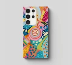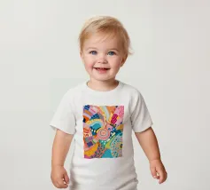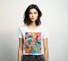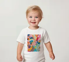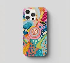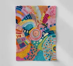 Un disegno astratto intricato e vibrante, con una serie di forme, punti e linee in un'allegra tavolozza di colori. La densa composizione crea un effetto caleidoscopico, pieno di energia e di giocosa complessità.