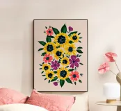 I caldi girasoli sbocciano in morbidi toni acquerellati. Un tocco di estate, luce e gioia di vivere.