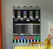 A digital pattern displays a series of geometric shapes with a variety of colors, resembling a TV test screen. Parallel lines and rectangles create a structured and vibrant composition.