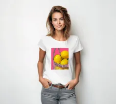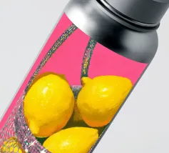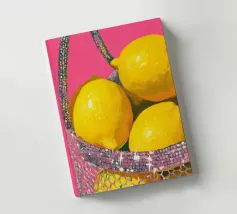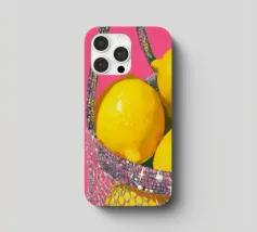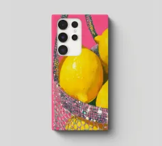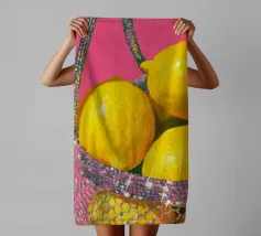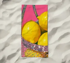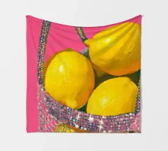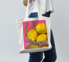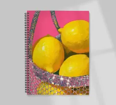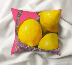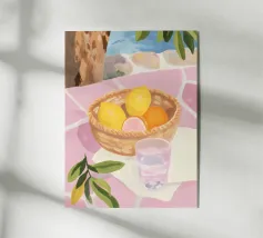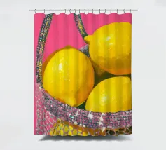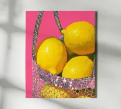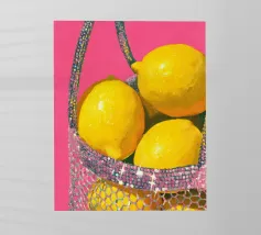Questo vivace design pop art combina limoni gialli con una tasca minimalista in rete scintillante e colori vivaci come il rosa e il verde tenue. Ideale come arte culinaria per la cucina, aggiunge un accento fresco e moderno alla vostra vita quotidiana.
