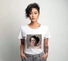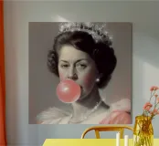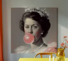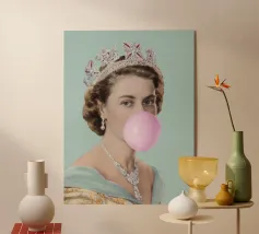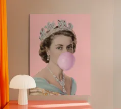 "Glitter Queen" offre una scintillante reinterpretazione dell'iconica Regina Elisabetta II, affettuosamente chiamata "Mummia" dal figlio Carlo. In quest'opera, la protagonista è raffigurata con una posa pop e una corona scintillante. È un ritratto che porta una prospettiva scanzonata e moderna a una figura di fama mondiale, sfidando le aspettative e aggiungendo un tocco di glamour e divertimento alla regalità".