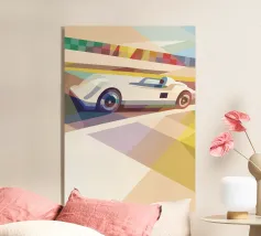 Illustrazione di un go-kart minimalista su una pista con uno stile geometrico moderno.
