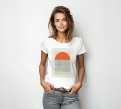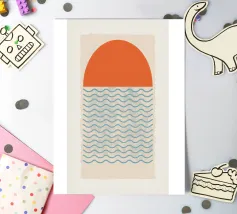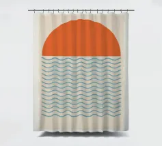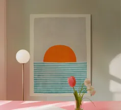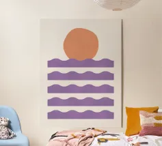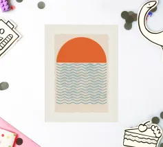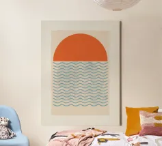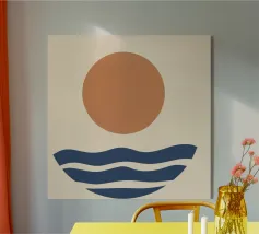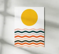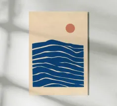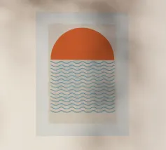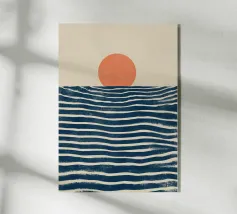 Un'opera astratta con un sole arancione semicircolare che sembra gocciolare in uno specchio d'acqua rappresentato da linee blu verticali e ondulate. La composizione è unica, moderna e visivamente intrigante.