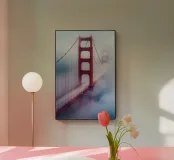 Il Golden Gate Bridge è avvolto da un incantevole strato di nebbia, con le sue torri che spuntano come sentinelle in un paesaggio da sogno. Il rosso vibrante dell'acciaio contrasta nettamente con i toni tenui della nebbia, creando una composizione suggestiva ed eterea. Questa immagine iconica cattura l'interazione unica tra gli elementi naturali di San Francisco e le sue meraviglie create dall'uomo, offrendo una rappresentazione tranquilla e quasi ultraterrena di uno dei ponti più conosciuti al mondo.