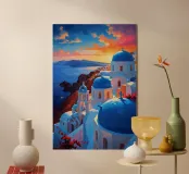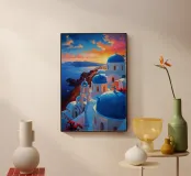 L'ora d'oro getta un incantesimo sulle chiese a cascata dalle cupole blu e sugli edifici imbiancati di Santorini. Il tramonto vibrante trasforma il Mar Egeo in una distesa scintillante di arancione e rosa, mentre i dettagli intricati del villaggio sulla scogliera irradiano calore. I fiori di bouganville incorniciano la scena, aggiungendo spruzzi di magenta. Questo splendido dipinto a olio cattura la miscela unica di bellezza naturale e architettura tradizionale greca, trasportando gli spettatori nel cuore del Mediterraneo.