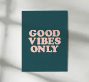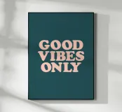 Infondete il vostro spazio di positività con questa stampa tipografica di ispirazione rétro. La frase edificante "Good Vibes Only" è riportata in caratteri retrò color pesca su un ricco sfondo verde petrolio. Questo pezzo accattivante combina il fascino vintage con un mantra moderno, perfetto per aggiungere un tocco di ottimismo a qualsiasi ambiente. Dalla zona giorno all'ufficio, questa opera d'arte rallegra l'umore e promuove un'atmosfera positiva. Lasciate che questa elegante stampa serva da promemoria quotidiano per abbracciare la buona energia e mantenere una visione ottimistica della vita.