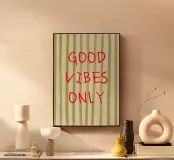 Un messaggio luminoso ed edificante per una casa felice. Questa scritta a mano riporta la classica frase "GOOD VIBES ONLY" su un allegro sfondo a righe.