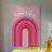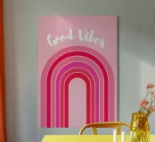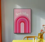 good vibes art, design arcobaleno rosa, estetica retrò, grafica allegra, messaggio edificante, stile minimalista colorato